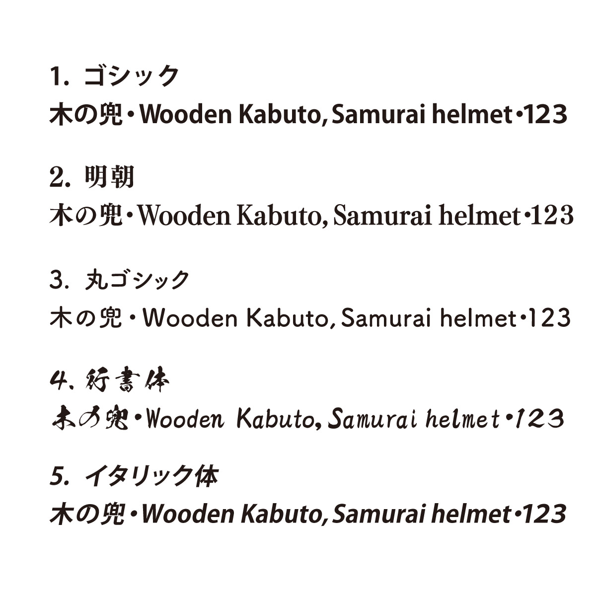 - 文字のフォントは5種(ゴシック/明朝/丸ゴシック/行書体/イタリック体)よりお選びいただけます。