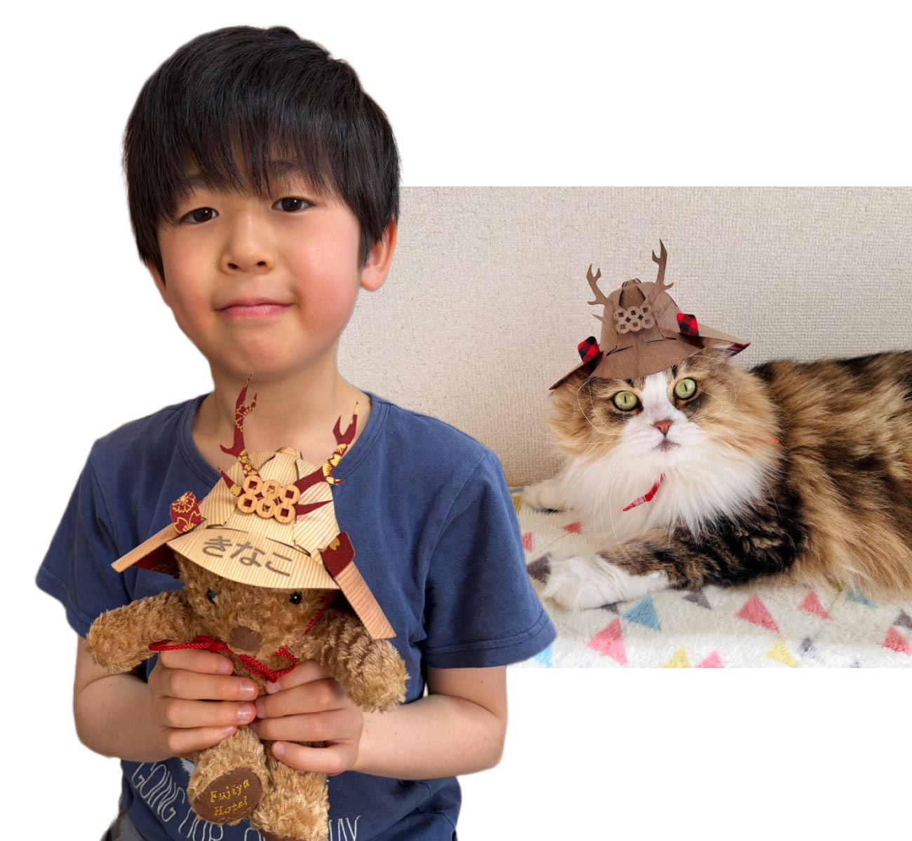 独自の「木の紙」技術で、本物の木材の質感と香りをそのままに、驚くほど軽い兜に仕上げました。ぬいぐるみやペットにもやさしく、端午の節句の撮影やお祝いで、実際に被って楽しめます。